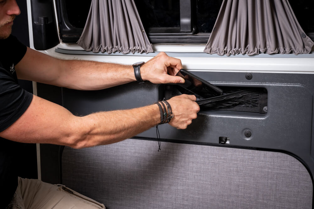 - Integrierter Campingtisch: Verabschieden Sie sich von umständlichen, losen Campingtischen. HideMyTable verfügt über einen eingebauten Campingtisch, der perfekt in die Schiebetürverkleidung passt. Er kann mit einem Handgriff herausgenommen werden und ist immer einsatzbereit.