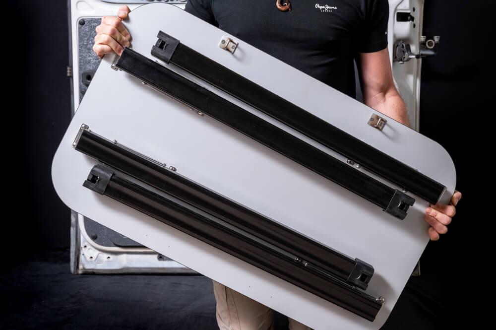 - Geräuschfrei während der Fahrt: Dank unserer innovativen und patentierten Konstruktion sorgt HideMyTable dafür, dass es während der Fahrt keine störenden Geräusche gibt, und der Tisch auch im holprigen Gelände in der Verkleidung nicht klappert.
